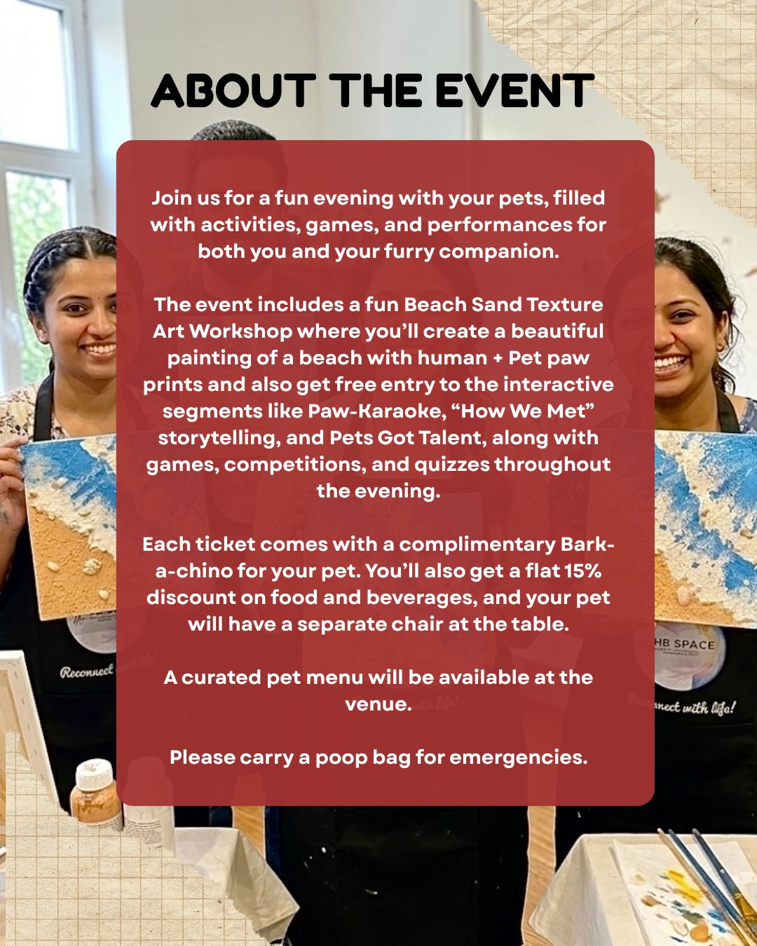 The event includes a fun Beach Sand Texture Art Workshop where you’ll create a beautiful painting of a beach with human + Pet paw prints and also get free entry to the interactive segments like Paw-Karaoke, “How We Met” storytelling, and Pets Got Talent, along with games, competitions, and quizzes throughout the evening.
